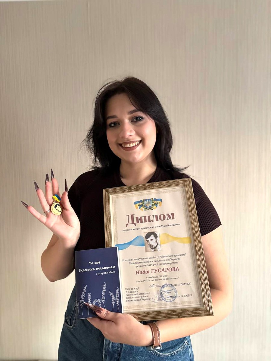 2025 рік для нетішинки Надії Гусарової був багатим на звершення, зокрема на літературній ниві. Студійка мистецького об’єднання «Нетішинський розмай» при Палаці культури була номінована на премію ім. Миколи Дубова Рівненської організації Спілки письменників України як автор книги «То хоч вклонюсь талантам» і стала переможницею цього творчого змагання у жанрі «Поезія».